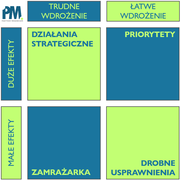 Krok trzeci, który jest absolutnie kluczowy dla sukcesu, to doprecyzowanie kryteriów selekcji. Poświęćcie kilka, a nawet kilkanaście minut razem z zespołem na dokładne uściślenie, co dla Was oznaczają poszczególne kryteria. Jest niezwykle ważne, aby wszyscy w zespole rozumieli tak samo, co kryje się pod pojęciami „małe” i „duże” nakłady pracy czy finansowe. Warto o tym porozmawiać, ponieważ perspektywa co do znaczenia kwot może być bardzo różna w zależności od miejsca w strukturze firmy. Nie raz spotkasz się z sytuacją, że dla jednej osoby kilka tysięcy złotych będzie znaczącą barierą nie do zaakceptowania, podczas gdy inna osoba zacznie się poważniej zastanawiać dopiero, gdy kwota ma sześć cyfr.